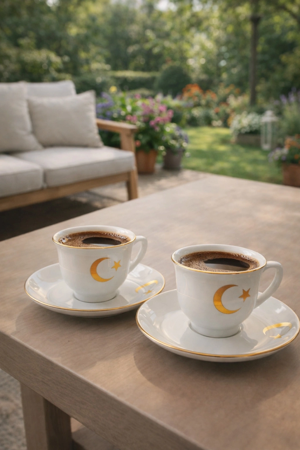 Ay yıldız desenli porselen Türk kahvesi fincan takımı, şık sunum ve kaliteli kullanım arayanlar için özel olarak tasarlanmıştır.; Gold yaldız detayları sayesinde lüks kahve fincanı görünümü sunar.; Isıyı koruyan porselen yapısı, kahvenin köpüğünü uzun süre muhafaza eder.; Günlük kullanımın yanı sıra hediyelik kahve fincanı, çeyizlik fincan takımı, misafir sunum seti olarak tercih edilir.; Bahçe, salon ve sehpa sunumlarında estetik duruş sağlar.; Fotoğraflarda görüldüğü gibi modern ve zarif tasarımıyla dekoratif olarak da kullanıma uygundur.