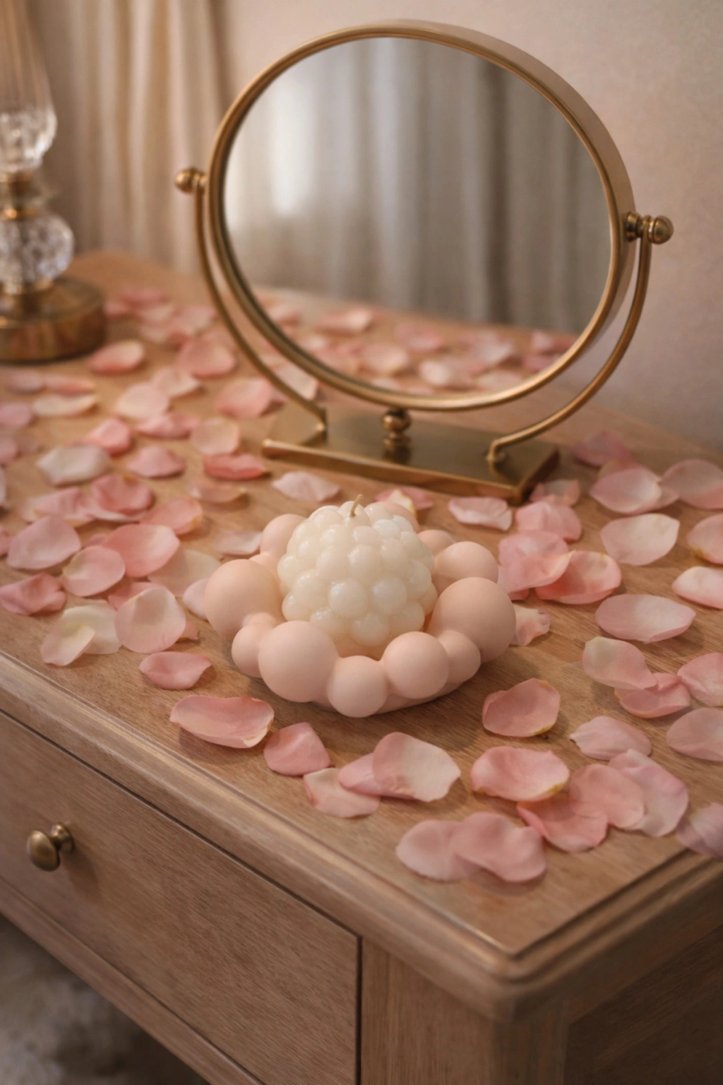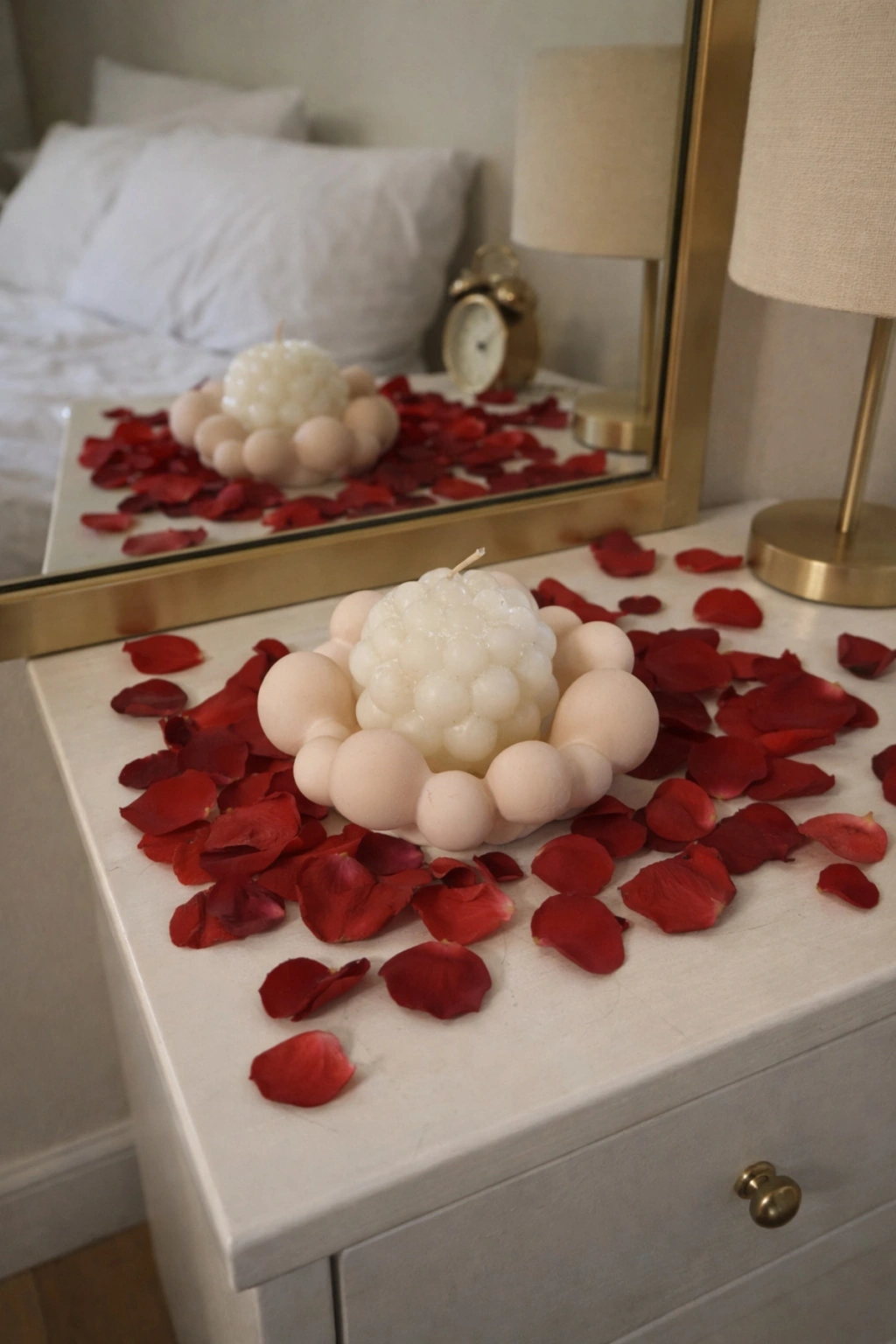 Romantik ve zarif detayları sevenler için tasarlanan el yapımı pembe bubble organizer veya mumluk ve beyaz dekoratif bubble mum seti, yatak odası, makyaj masası ve şifonyer dekorasyonuna estetik bir dokunuş katar.; Modern minimal tasarımı ve yumuşak pembe tonlarıyla hem şık hem de göz alıcı bir atmosfer oluşturur.; Özellikle Sevgililer Günü hediyesi, yıl dönümü sürprizi veya romantik oda dekorasyonu için ideal bir seçimdir
